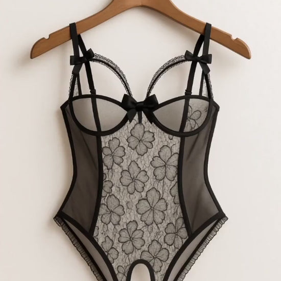 ✨ Unione di Pizzo & Tulle: Un pannello centrale in pizzo floreale scolpisce una silhouette da sogno, mentre il tulle trasparente sui lati gioca con ciò che si mostra e ciò che si cela. 🎀 Dettagli Fiocchi in Raso: Piccoli fiocchi neri birichini impreziosiscono le spalline e il décolleté, aggiungendo un tocco di finta innocenza a questo modello decisamente malizioso. 🎯 Vestibilità Perfetta: Le spalline sono completamente regolabili per adattarsi perfettamente al tuo corpo e garantire il massimo comfort durante il gioco. ❗️ Nota Importante: Per un look completo, lascia libera la tua fantasia! I copricapezzoli mostrati in foto sono accessori da shooting e non sono inclusi con il body.